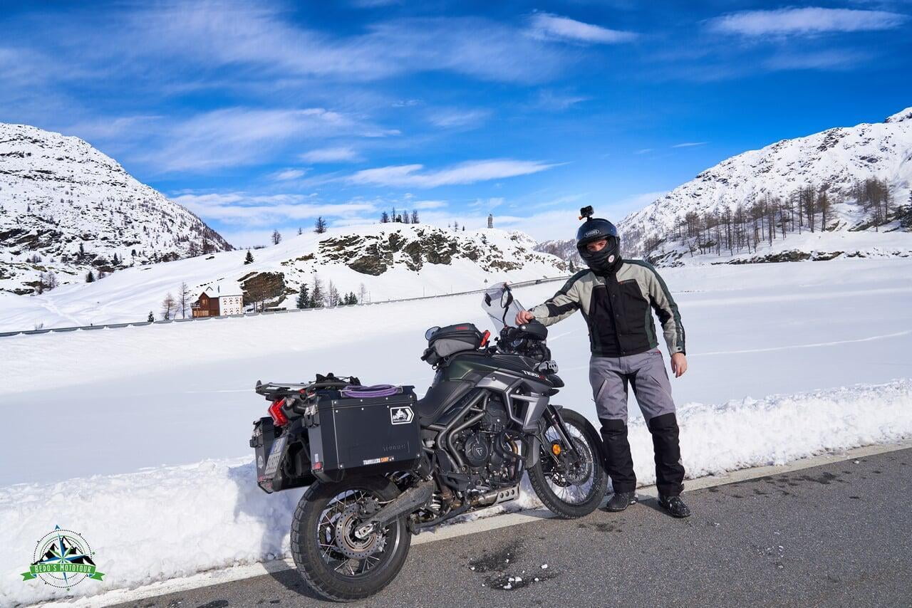 I prati e i tetti delle baite sono ricoperti da un sottile strato di neve bianca, in accordo con il termometro della moto, dove ormai campeggia il classico fiocchetto di neve. La salita prosegue, tra prati innevati, boschi di larici che esprimono ogni possibile sfumatura dell'arancione e vette ammantate di neve, mentre il sole inizia a fare capolino tra i banchi di nuvole alte nel cielo. La salita al passo è puro spettacolo e la manutenzione delle strade svizzere permette di circolare in tutta sicurezza su un asfalto asciutto e perfettamente sgomberato dalla neve.